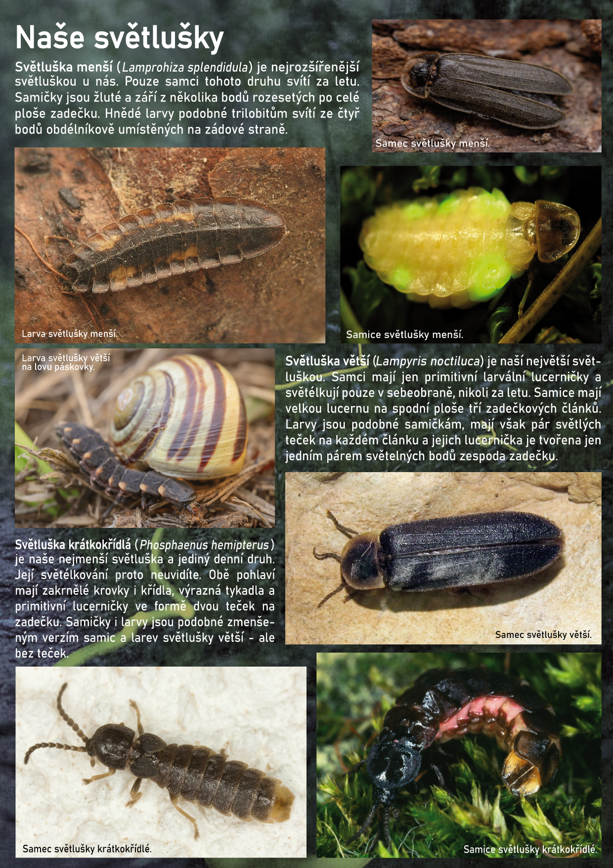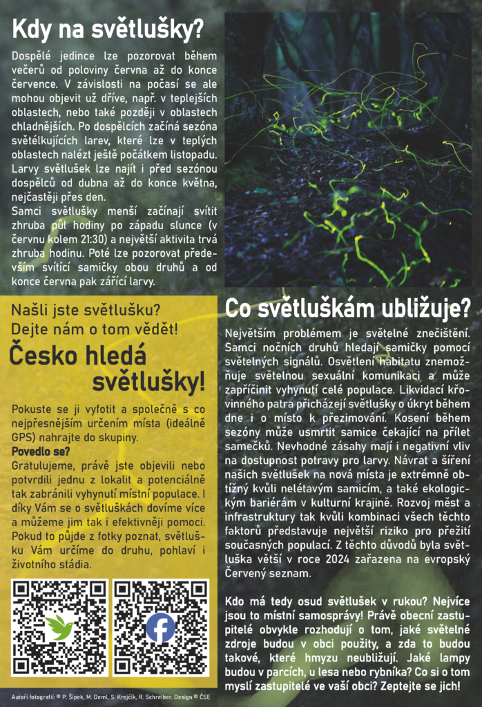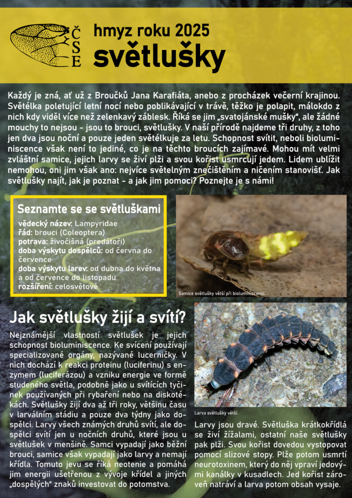 Stejně jako v loňském roce, i letos Česká společnost entomologická vyhlašuje hmyz roku. V letošním roce se jím stávají světlušky – dobře známí brouci, ze kterých však většina lidí nikdy neviděla více, než záblesk světla při procházce letní nocí. Světlušky jsou přitom mimořádně zajímavé, zdaleka ne všechny jsou noční a mají pozoruhodné životní strategie. Člověk je navíc svým působením na krajinu značně ovlivňuje a ohrožuje, třeba světelným znečištěním. Jak světlušky vlastně vypadají, které u nás žijí – a jak jim pomoci? Poznejte je s námi!
